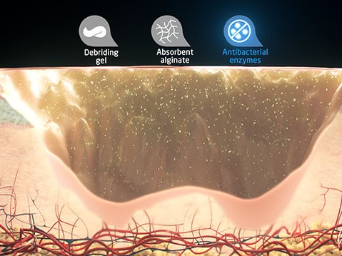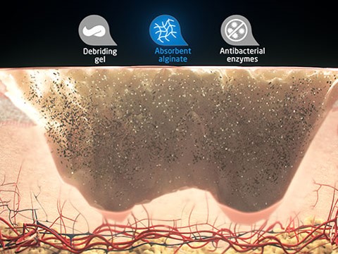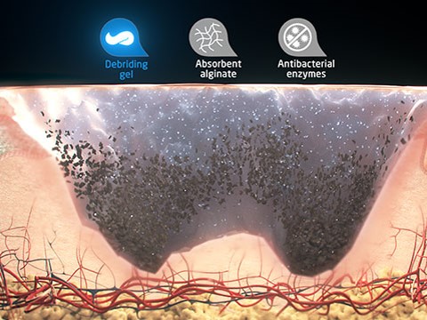הג'ל ממיס רקמה נמקית ופיברין וסופג אותם ממיטת הפצע.