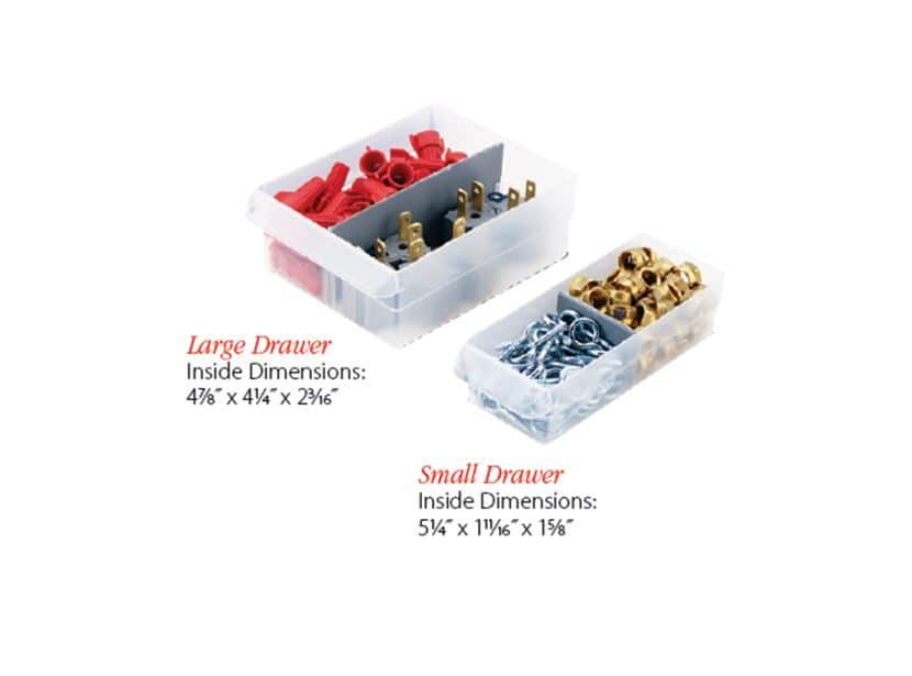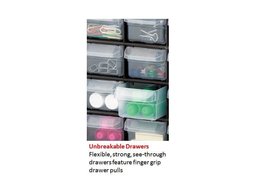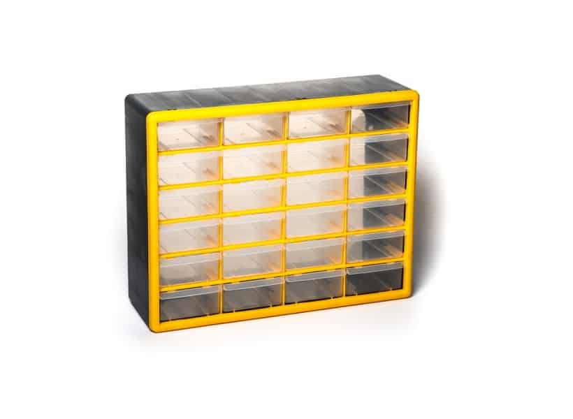 יחידת האחסון עשויה פלסטיק מחוספס חזק ועמיד וכוללת 24 יחידות מגירות/תאי אחסון בגדלים שונים
