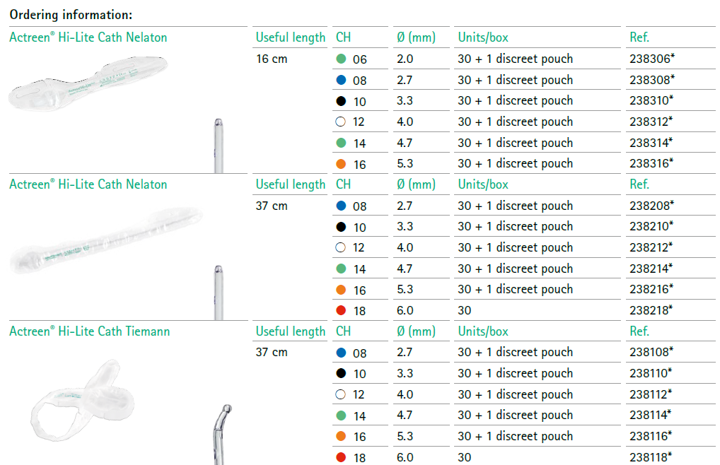 מידות קטטר לנשים: אורך 9 ס"מ קוטר 2.7 מ"מ אורך 9 ס"מ קוטר 3.3 מ"מ אורך 9 ס"מ קוטר 4.0 מ"מ אורך 9 ס"מ קוטר 2.7 מ"מ אורך 9 ס"מ קוטר 4.7 מ"מ אורך 9 ס"מ קוטר 5.3 מ"מ |