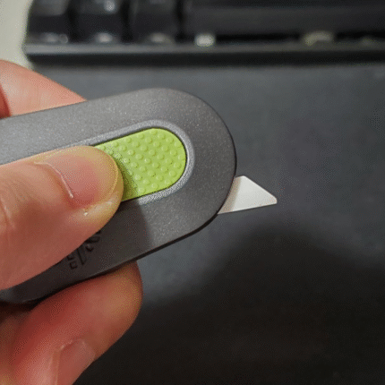 סכין בטיחות בעל מבנה ארגונומי, קצה בצורת קרס (Hook Knife) ולהב חבוי לחיתוך בטוח ויעיל של ניילון נצמד (שרינק), דבק מסקינטייפ ואריזות קרטון.