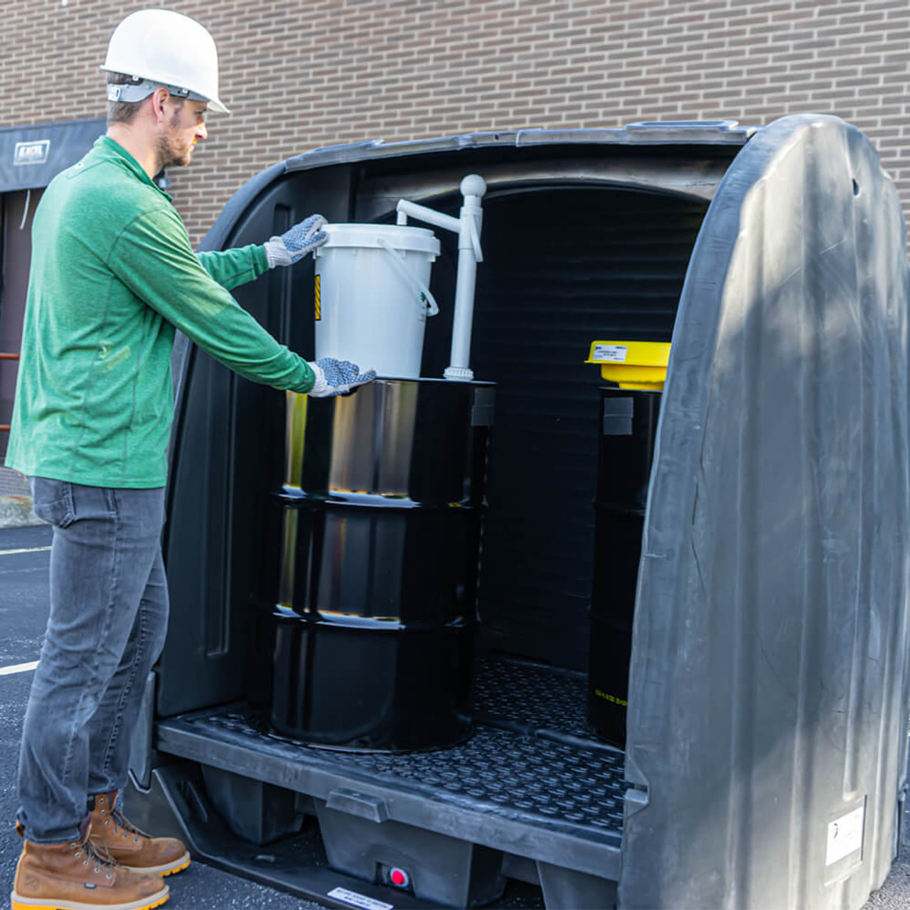 סככת אחסון חיצונית איכותית מבית Enpac, מיועדת לאחסון בטוח של עד 4 חביות בנפח 200 ליטר כל אחת. הסככה מונעת דליפות וחלחול נוזלים מזיקים לסביבה, ועומדת בדרישות הבטיחות הסביבתיות המחמירות לאחסון חומרים מסוכנים ודליקים. היא מספקת פתרון אחסון חיצוני עמיד בפני חלודה וקורוזיה.